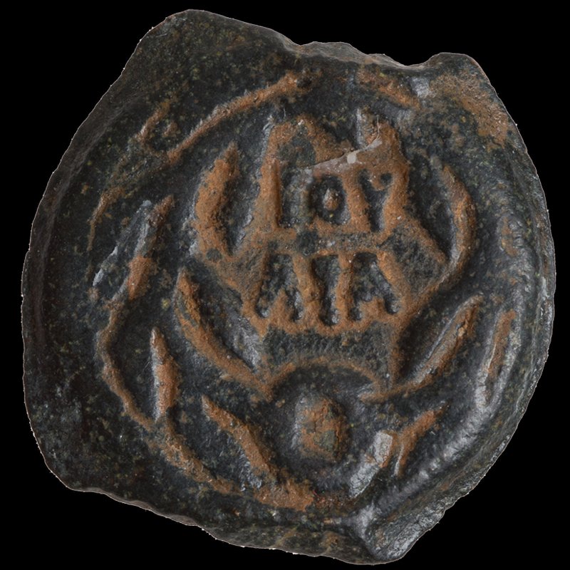 This prutah, minted at Caesarea Maritima by Valerius Gratus, the Roman prefect of Judea in 16 CE, depicts on the obverse a wreath surrounding an inscription and on the reverse three lilies. The prutah (in Hebrew פרוטה) was a Jewish bronze coin of low value minted by both the prefects of the Roman province of Judea, and also by the Jews during the First Revolt. They are sometimes also referred to as “Masada coins.” The inscriptions on this prutah are in Greek. The inscription on the reverse, “L Γ,” records the year in which the coin was minted, the third year of the reign of Tiberius. The inscription on the obverse, “IOVΛIA,” “Julia,” probably refers to Livia Drusilla, the mother of Tiberius and the wife of Augustus, who came to be known as Julia Augusta in 14 CE. She was depicted on provincial coinage during Augustus’s reign, and coins minted under Tiberius seemingly arguably allude to her. Most significantly Tiberus minted coins with the legend “SALVS AUGUSTA” and a portrait of a woman in 22-23 CE which likely commemorates her return to health after a serious illness (see Vagi, Coinage and History, p. 115-116). Her name appears on many coins of this type minted by prefects of Judea, and Josephus tells us that she had a particular interest in the areas of Syria, Judea, and Egypt, with Salome (the daughter of Herod Antipater and Herodias) bequeathing her a plantation of palm trees in Phasaelis, north of Jericho, when she died in 10 CE (Josephus, Jewish Wars II.9; see Mason, Flavius Josephus, p. 136).