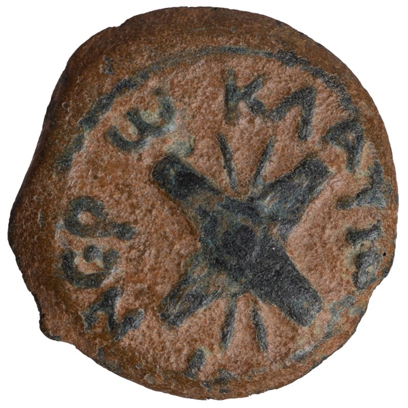 This prutah, minted at Caesarea Maritima by Antonius Felix, procurator of Judea, in 54 CE, depicts on the obverse two shields and javelins, and on the reverse a palm tree. The prutah (in Hebrew פרוטה) was a Jewish bronze coin of low value minted both by the prefects of the Roman province of Judea, and also by the Jews during the First Revolt. They are sometimes also referred to as “Masada coins.” The inscription is in Greek, and spans from the obverse to the reverse, refers to Nero Claudius Caesar (Nero came to the throne in 54 CE after the death of his uncle and adopted father Claudius) and Britannicus, Claudius’s son by birth. The inscription also records the year in which the coin was minted, “L IΔ KAI”: the fourteenth year of the reign of the emperor (KAI being an abbreviation of Καῖσαρ, kaisar). We can therefore date the coin to 54 CE (Claudius came to power in 41 CE), which is also the year he died.