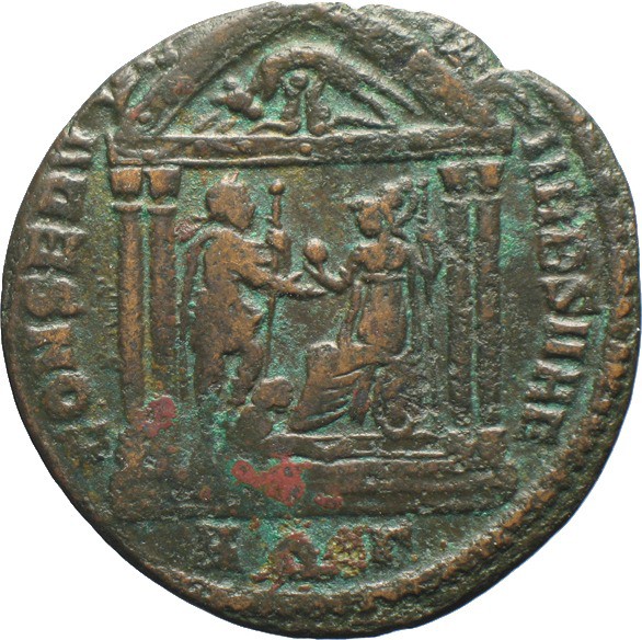 Type 2: A winged Victory is depicted in a tetrastyle temple crowning Roma with one hand and holding palm in the other. Roma is depicted seated on a shield, holding a globe and a sceptre. Between Victory and Roma stands a captive (bronze emissions minted at Aquileia in 307 CE, RIC VI, Aquileia, no. 115, p. 325; at Ticinum in 308-310 CE, RIC VI, Ticinum, no. 106-108, p. 295-296).