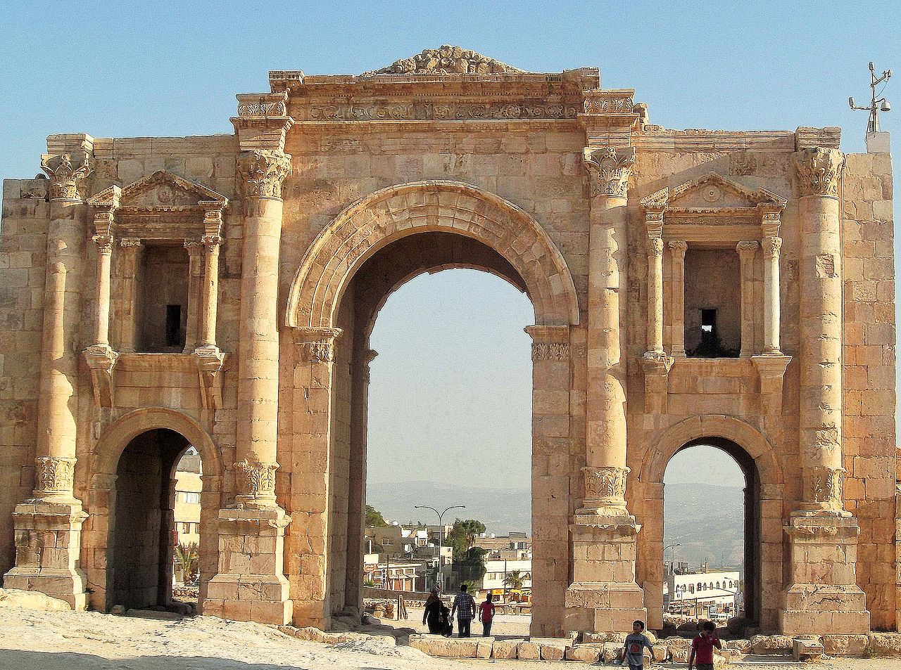 The arch of Hadrian was located 460 m southward of the main Southern Gate of the city of Gerasa, today Jerash (Jordan). The arch itself consists in a rectangular structure, 21 m high, with three arched gateways. The arch is characterized by a dual façade, looking north towards the city, and southward towards the road. The two facades were similar, albeit not identical in their architectural details. The central archway is larger and higher than the two flanking ones. Four huge Corinthian columns frame the façade. Each column stands on a pedestal and a base, which is topped by a decoration of acanthus leaves. The architrave of the main arch, as well as those of the two flanking arches, stand on two flanking pilasters topped by two capitals. The two flanking archways are topped by two identical niches. Each niche is located on a small entablature, which stands on two pilasters crowned with capitals. The niche itself is flanked by two protruding Corinthian columns, which support a broken triangular pediment. According to Kraeling, who excavated the arch, the arch was probably wider in origin, with two superimposed niches on each side of the flanking archways. The lower flanking niche was framed by two pilasters, and topped by a round gable, while the upper flanking niche, also framed by two pilasters, was topped by a triangular gable. The whole arch was crowned by an attic, possibly supporting a dedicatory inscription. The lower part of the attic was decorated with a floral frieze of acanthus leaves. The central part of the frieze was crowned by a triangular cornice (Nassar, “Hadrian’s Arches from Roman period Jordan,” p. 247-249).