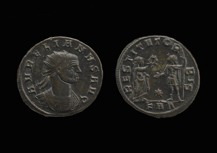 Aurelianus depicting the head of Aurelian and a woman presenting a wreath to Aurelian restitutor orbis (274-275 CE)